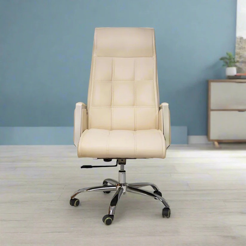 يتميز كرسي مكتب جلد مستورد CHG 21 بتصميمه الأبيض والأنيق والعصري حيث يجمع بين الراحة والأناقة في آن واحد يأتي الكرسي بقاعدة من الكروم اللامع مما يضيف لمسة من الفخامة على أي مكتب، الأذرع المصنوعة من الكروم تضيف دعم مما يجعل الجلوس لفترات طويلة أكثر راحة كما أن اللون الأبيض يتيح تنسيق الكرسي بسهولة مع مختلف ألوان واشكال الأثاث المكتبي، تم تصميم هذا الكرسي ليكون عمليًا ومريحًا حيث يوفر دعم ممتاز للظهر بفضل تصميمه المدروس، يمكن استخدامه في بيئات العمل المختلفة، سواء كانت مكاتب خاصة أو مساحات عمل مشتركة، كما أن المواد المستخدمة في تصنيع الكرسي تضمن متانة عالية وسهولة في الصيانة مما يجعله استثمار جيد للمكاتب التي تبحث عن الجودة والراحة.
